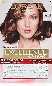 صبغة إكسلانس بني فاتح ذهبي (رقم 5.3) من لوريال باريس هي صبغة شعر دائمة توفر لوناً غنياً ولمعاناً مع عناية ثلاثية للشعر . تحتوي على تركيبة غنية بـ البرو-كيراتين و السيراميد و الكولاجين لحماية الشعر وتقويته وتغذيته. توفر تغطية كاملة للشعر الرمادي وتُعرف بنتائجها سريعة ومظهرها الطبيعي الذي يدوم طويلاً.