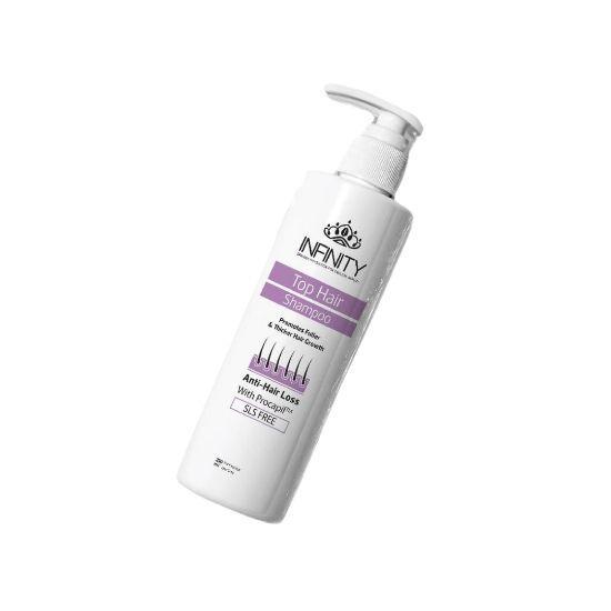شامبو انفينيتي توب هير بحجم 250 مل هو شامبو مضاد لتساقط الشعر مصمم لتقوية بصيلات الشعر وتحفيز نموه، مع تركيبة تحتوي على مكونات مثل الكافيين، البيوتين، الأرجان، والثوم. يعمل على تنظيف فروة الرأس بلطف، تغذية الجذور، وتقليل