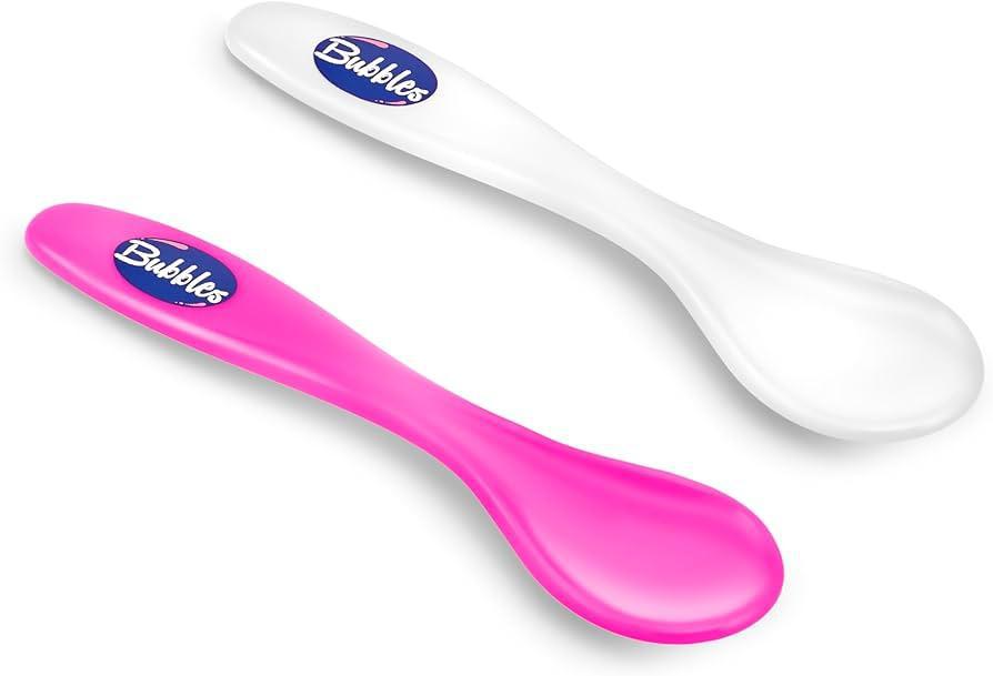 ملاعق بابلز الغذائية في عبوة من قطعتين باللونين الأبيض والوردي مصنوعة من مواد آمنة للأطفال مثل البولي بروبلين أو السيليكون الخالي من مادة BPA، وهي ذات حواف مستديرة لطيفة على اللثة وسهلة الحمل. كما أنها متينة وقابلة للغليان والتعقيم وغسالة الأطباق لتسهيل التنظيف.