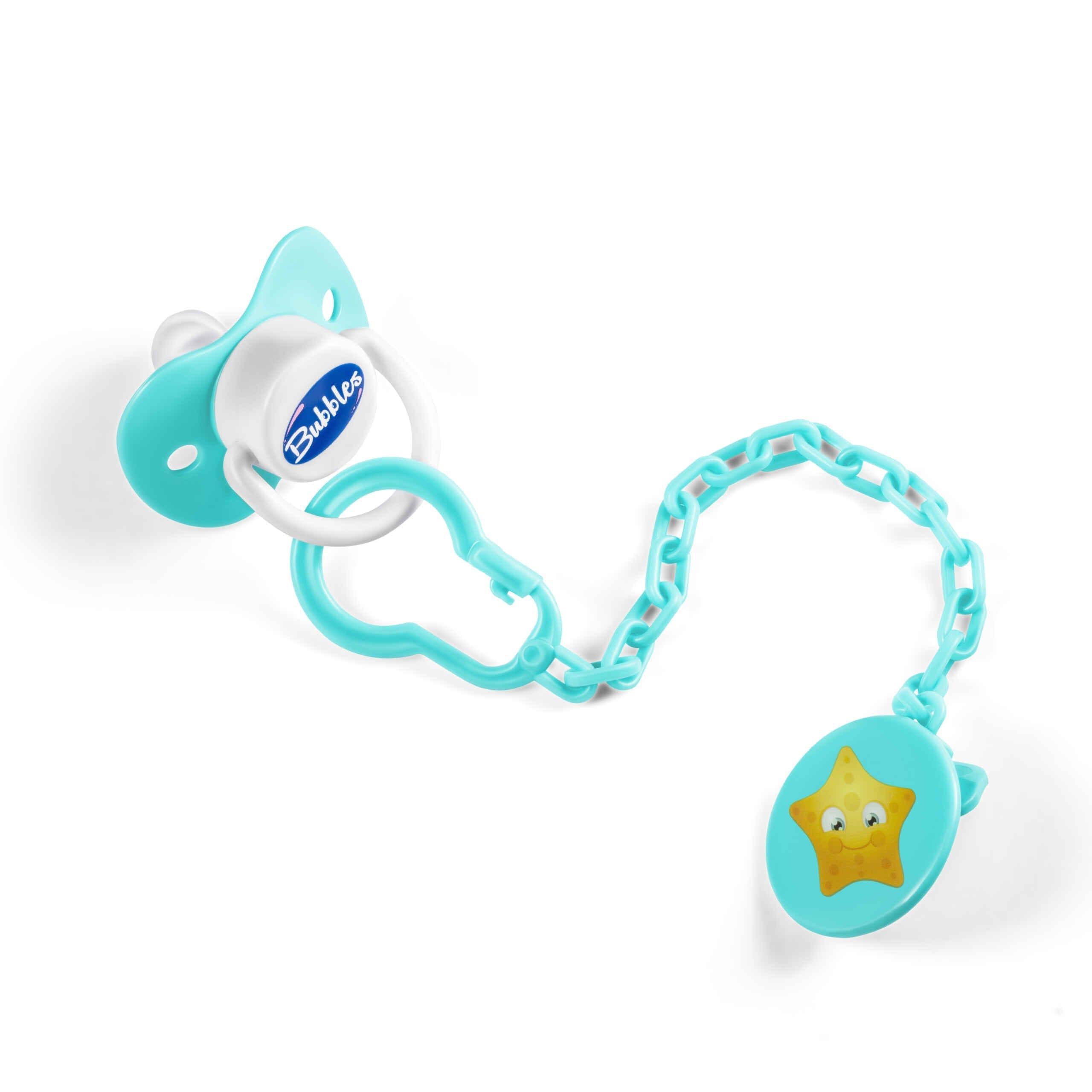 مزودة بسلسلة: تقدري تعلقيها وتثبتيها بملابس الطفل لحماية السكاتة من الوقوع والتلوث.