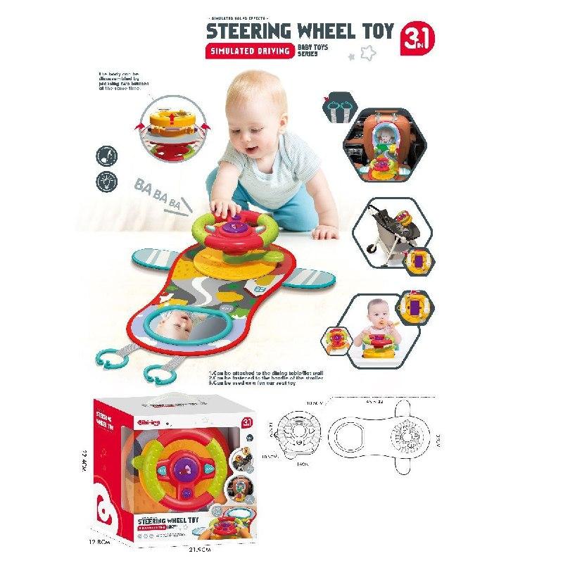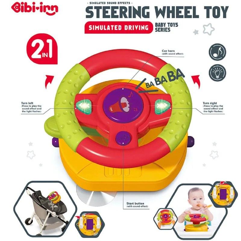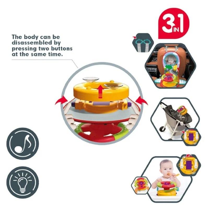 يمكن تثبيتها بمقبض عربة الأطفال يمكن استخدامها كلعبة ممتعة لمقعد السيارة لعبة دركسيون السيارة ..  لقيادة السيارة الحقيقي، يوجد بها كبسات بها صوت واضاءة للغمازات والزمور وإضافة إلى كبسة تشغيل السياراة وأصوات موسيقى واضاءة المقود نفسه إمكانية تحريكه مرفق أيضا مرآة آمنه للاطفال مناسبة من عمر 1 سنه فما فوق