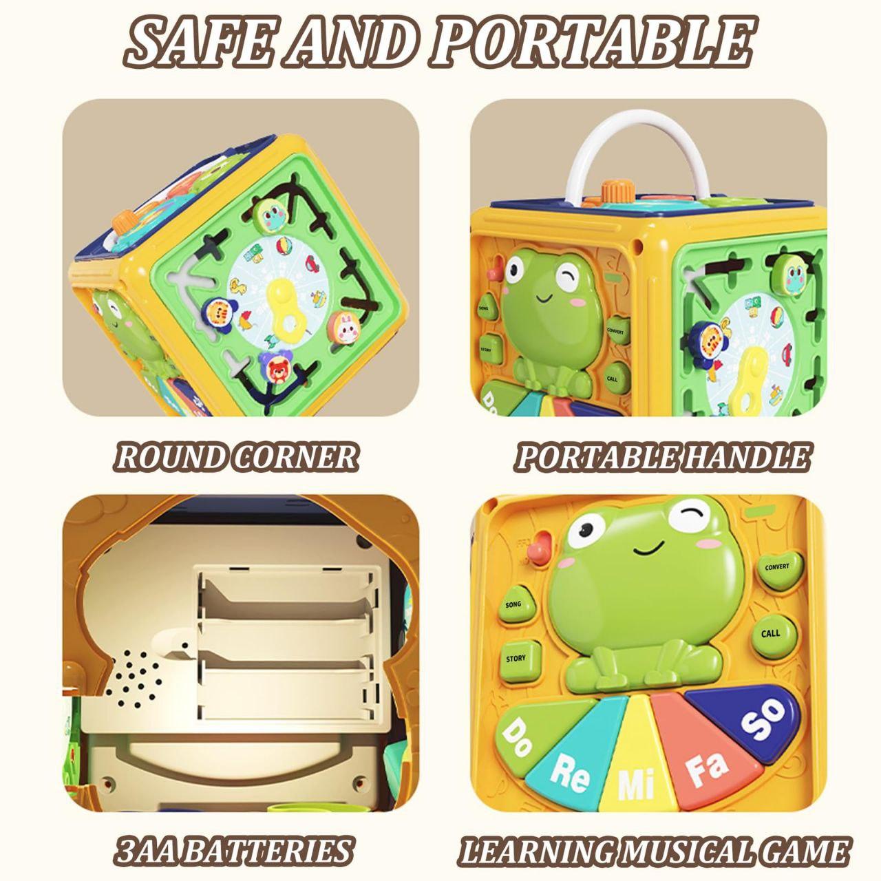 لعبة تعليمية متعددة الأنشطة للأطفال مكعب ممتع يجمع بين الموسيقى، الحركة، والأشكال، يساعد الطفل على التعلم باللعب. يحتوي على أزرار موسيقية (Do – Re – Mi)، تروس متحركة لتنمية المهارات الحركية والتنسيق بين اليد والعين، وأشكال ملونة للتعرف على الحروف والألوان. مصنوع من خامات آمنة وغير سامة، بحواف دائرية، وسهل الحمل، مناسب لتنمية الذكاء الحسي والسمعي للطفل من سن مبكر
