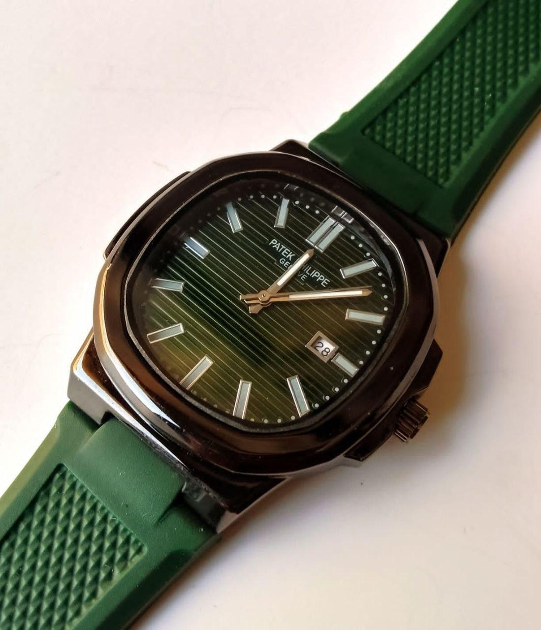 ساعة دائرية بحزام مطاطي اخضر