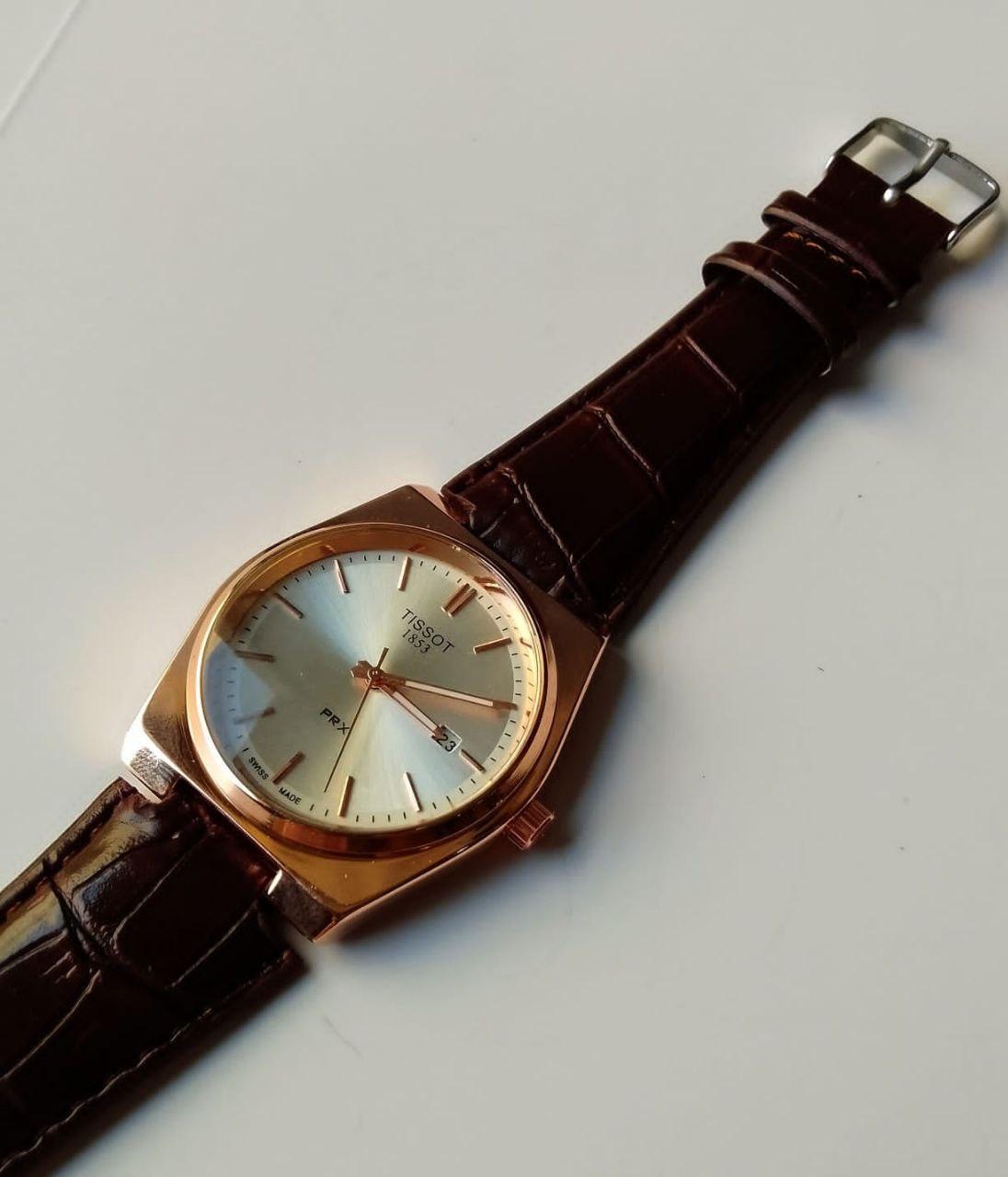 ساعة يد بني دائرية بتحديد ذهبي