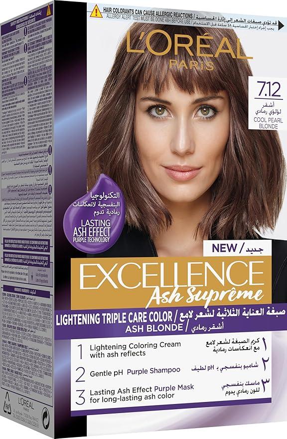 صبغة إكسلانس رقم 7.12 أشقر لؤلؤي رمادي هي صبغة دائمة من لوريال تقدم تغطية كاملة للشعر الأبيض وتتميز بتقنية الحماية الثلاثية (سيراميد، بروكيراتين، كولاجين) مع مستحضرات عناية مسبقة وبعد الصبغة لحماية الشعر وتغذيته