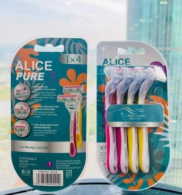 ماكينة الحلاقة النسائية ALICE PURE 3 بشفرات ثلاثية وشريط مرطب بالصبار والفيتامينات - نعومة فائقة في كل مرة ، عرض خاص (2 كارت بها 8 ماكينات متعددة الاستعمال) .