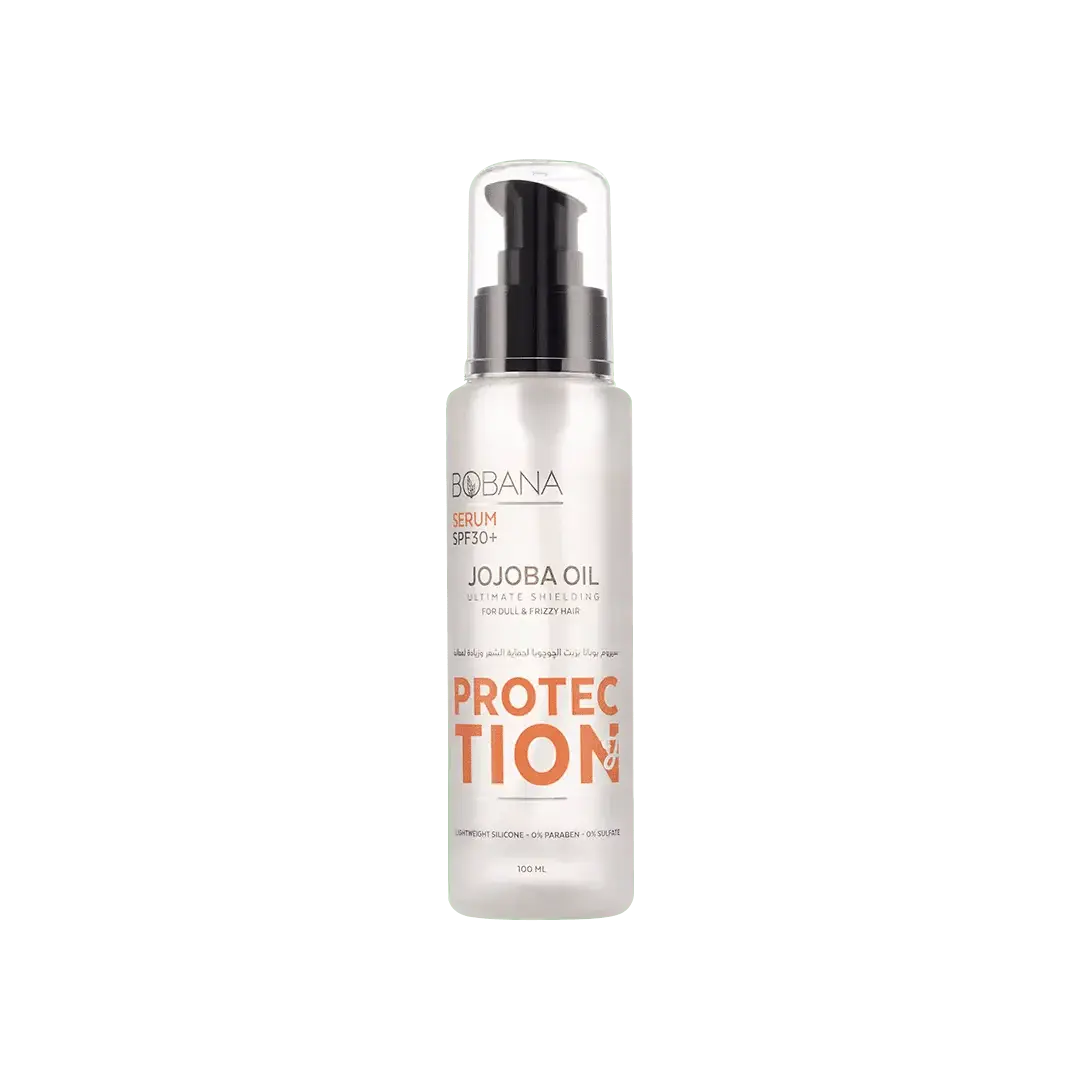 سيروم فائق الحماية من بوبانا غني بزيت الچوچوبا، يصلح الأطراف المتقصفة ويعمل كدرع واقي ضد حرارة التصفيف والاشعة الضارة ويعطي شعرك حماية SPF 30 +.